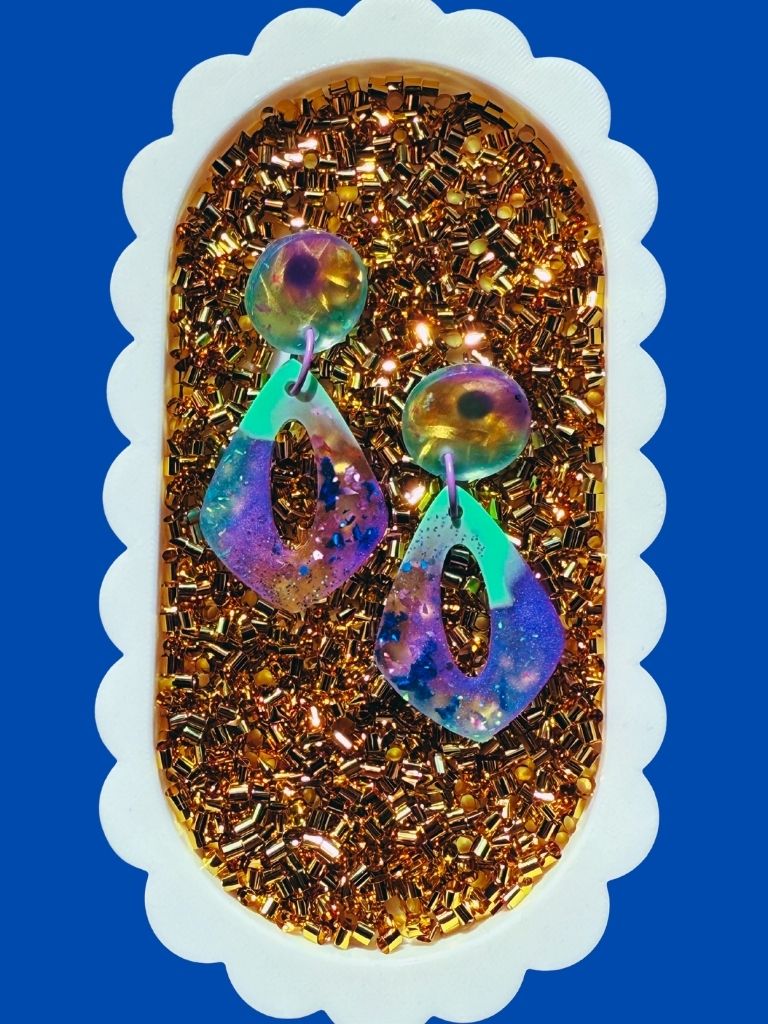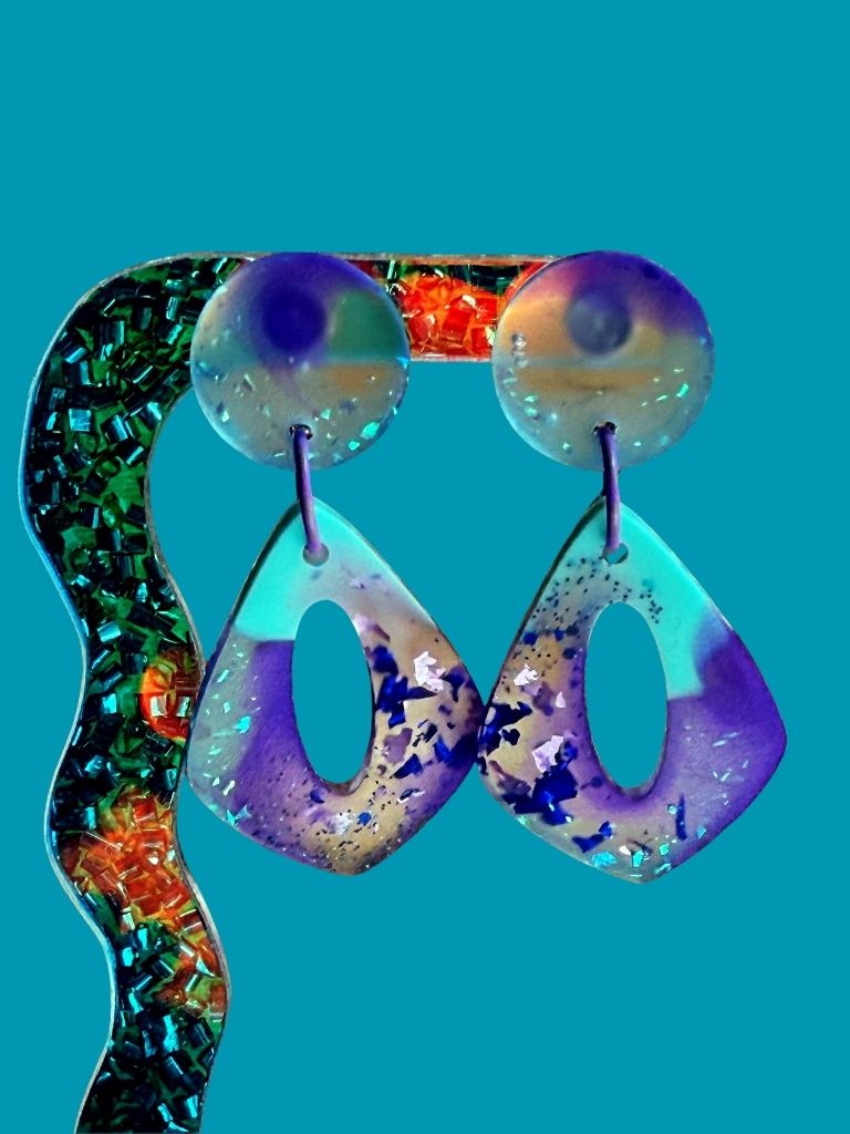 From the Vivid Voltage collection, these earrings radiate color in motion. Two matte epoxy resin components - one round and one open teardrop - glow with translucent layers of purple and mint, flickering with electric blue foil, rose foil, and iridescent shards. Light dances across every curve, creating a charged yet balanced design - playful, modern, and unmistakably alive.