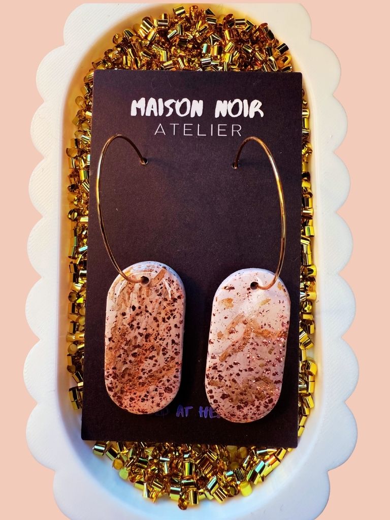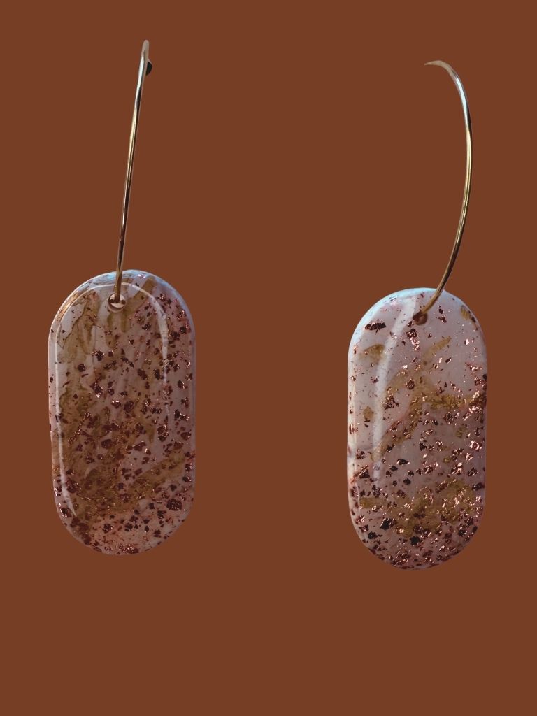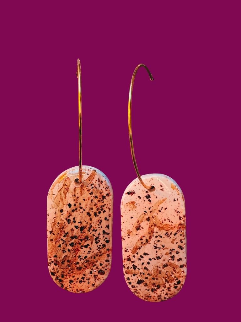 From the Glow Getter collection, these medium capsule earrings embody soft strength and subtle shimmer. Marbled gray and blush tones swirl together with delicate fragments of rose foil, sealed beneath a glossy resin topcoat. Hanging from polished gold hoops, they catch the light with quiet confidence - elegant, modern, and made for the ones who glow without trying.