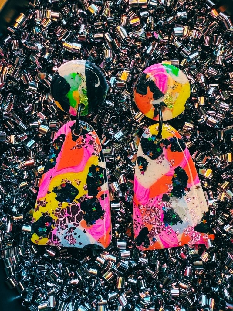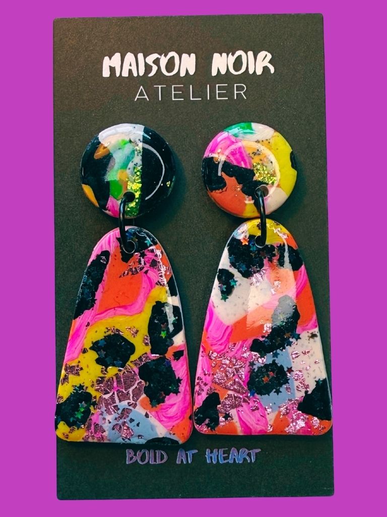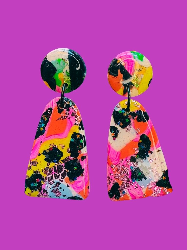 From the Vivid Voltage collection, these earrings are pure color chaos - polished to perfection. Two polymer clay components, a medium round top and a bold arch below, share the same striking slab pattern in hot pink, orange, black, bright yellow, white, and light blue. Pink foil and green glitter glint beneath a glossy resin coat, adding depth and shine. Vivid, fearless, and full of motion - this pair was made to turn heads and break monotony.