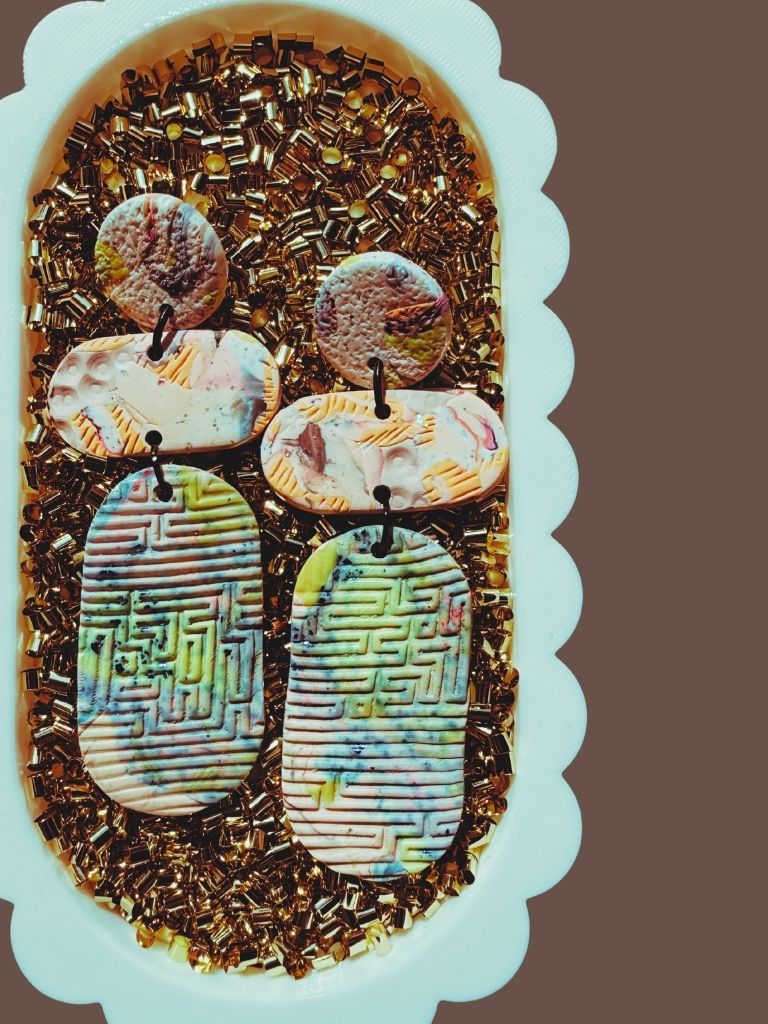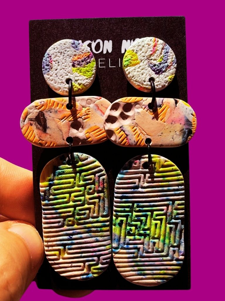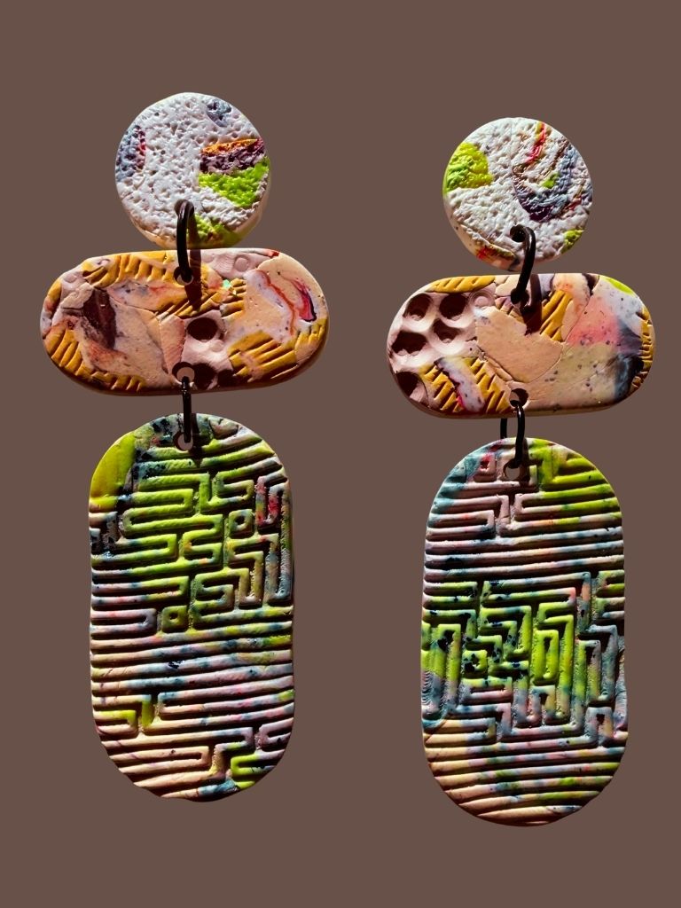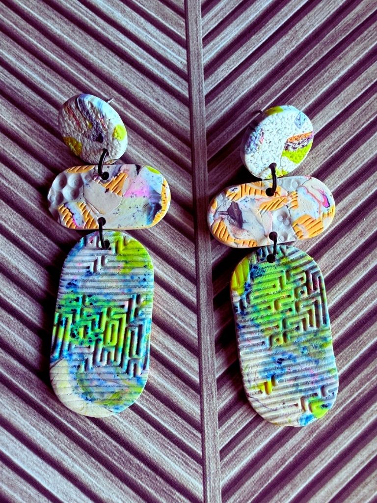 From the Depth & Distortion collection, these earrings explore texture and color through layered form. Three polymer clay components build the design - a white granite round flecked with lime, yellow, rose, turquoise, blue, and purple; a marbled oval in rose, orange, peach, magenta, and white granite; and a large oval base in soft rose and peach with flashes of electric blue foil and bright yellow. Finished with black findings, this pair captures movement in stillness - structured chaos rendered beautiful.