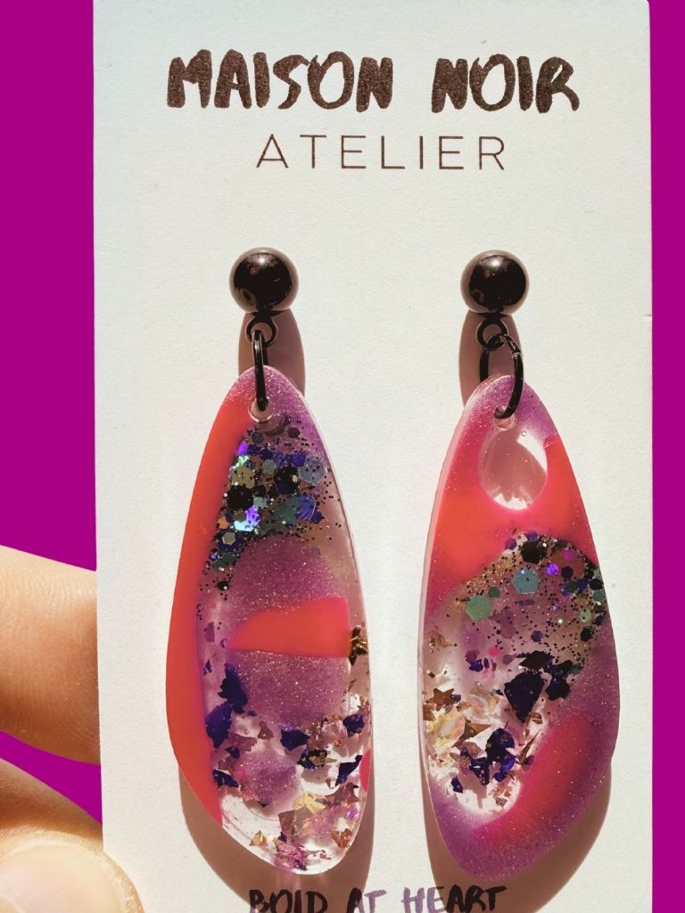 From the Vivid Voltage collection, these wing drop dangles radiate movement and color. Hanging from sleek black ball tops, the epoxy resin components fuse magenta, lilac, clear, and electric blue with flashes of rose foil and teal shard glitter. Glossy and full of energy, this pair embodies the pulse of color in motion - vibrant, fearless, and impossible to ignore.
