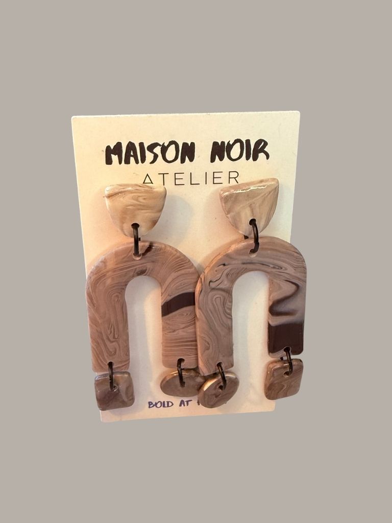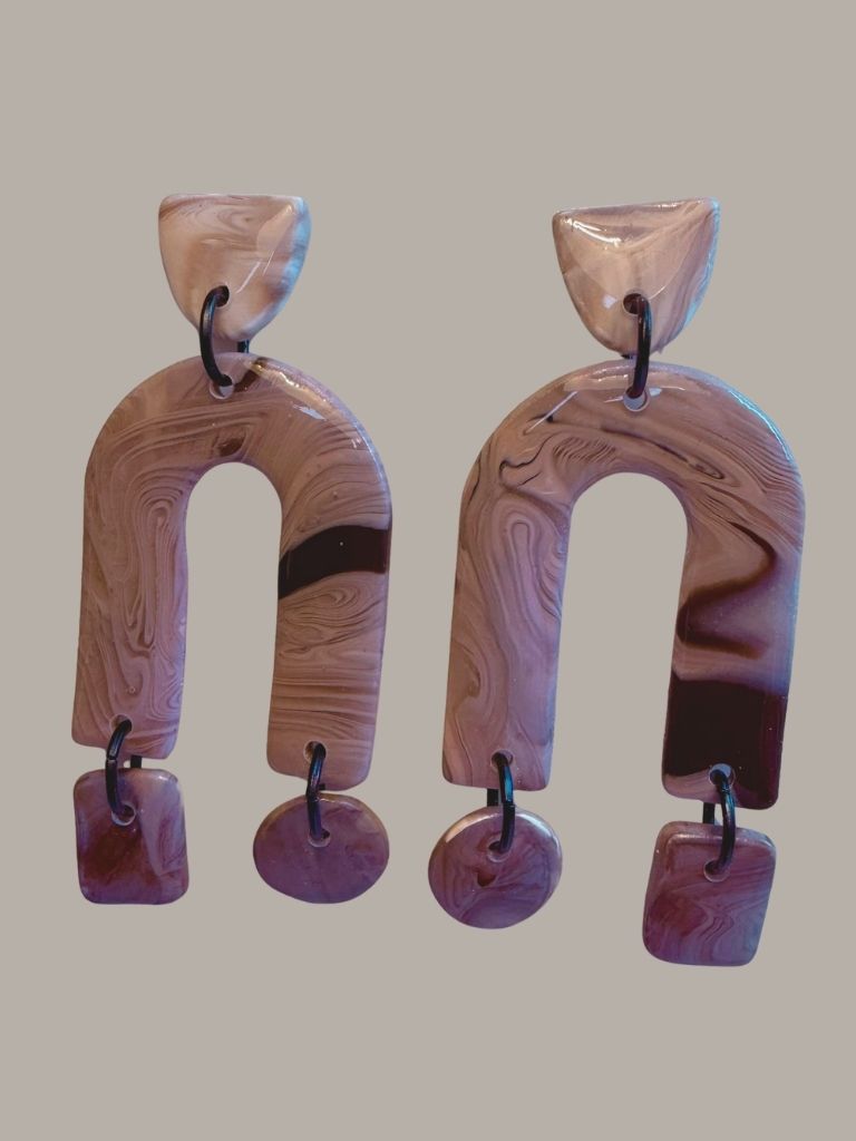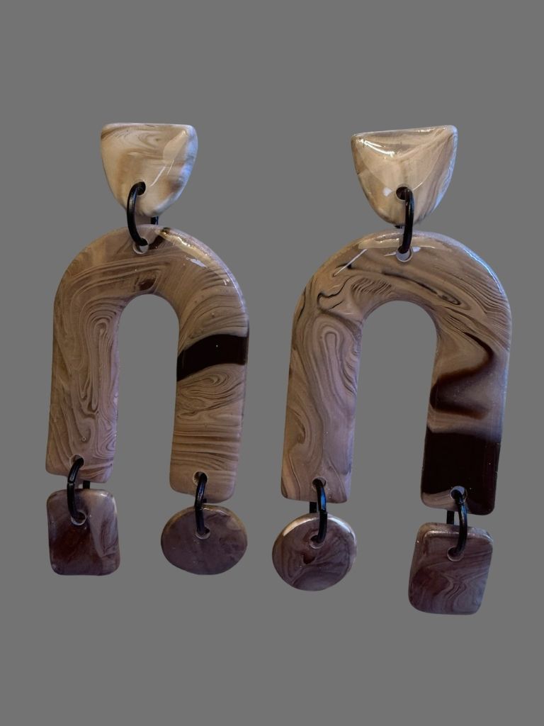 From the Terra & Forme collection, these polymer clay dangles explore structure through soft, natural tone. A small gray-and-charcoal marbled arch rests at the top, leading to a larger open arch that anchors the design. At each end, a charm - one round, one rectangular - adds subtle movement and balance. Sculptural, calm, and modern, this pair carries the quiet elegance of stone in motion.