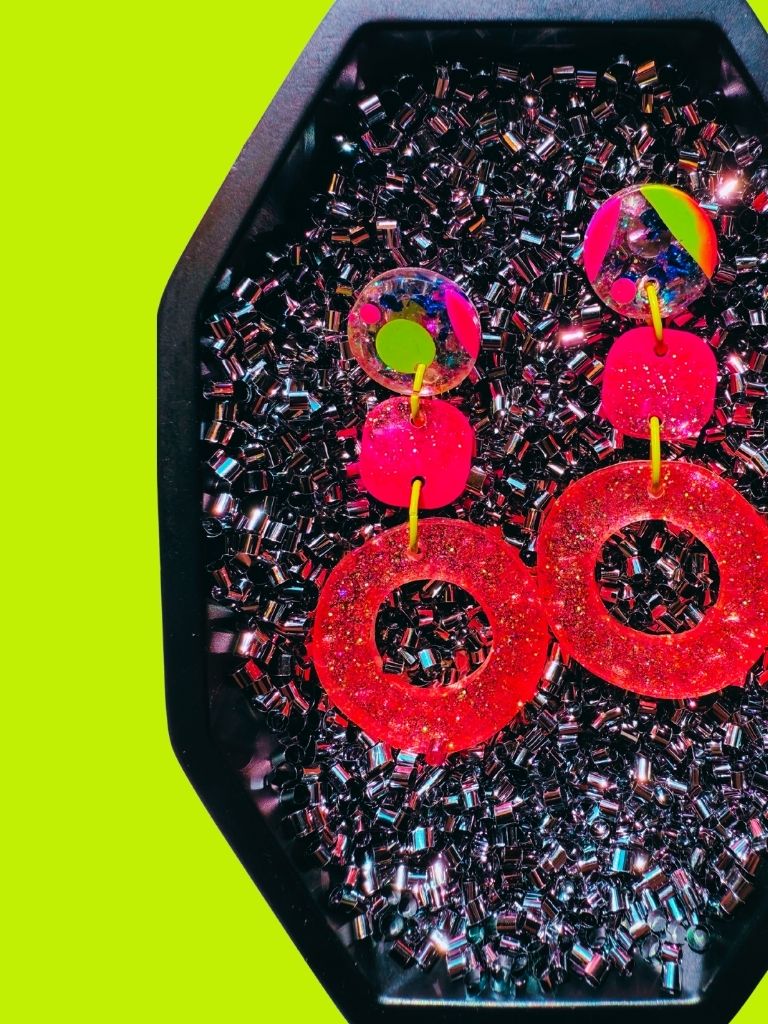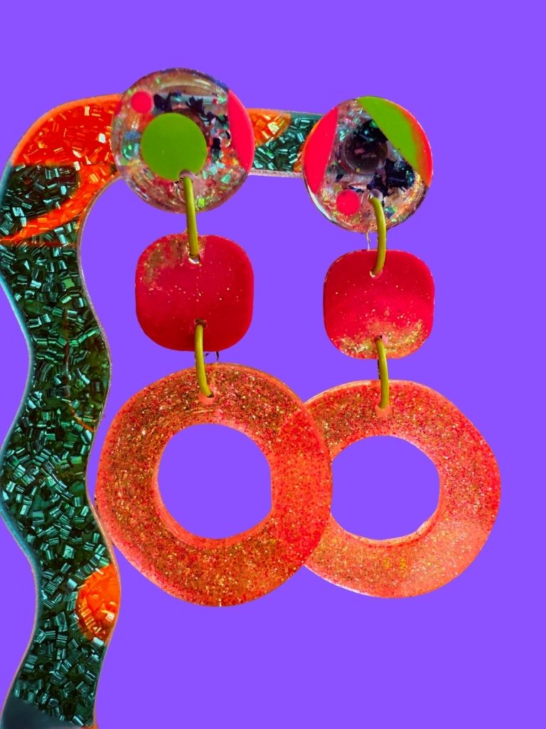 From the Vivid Voltage collection, these three-component dangles pulse with electric color and motion. A translucent round top glows with lime green and rose tones, layered with iridescent glitter and electric blue foil. The center square flashes fuchsia and sparkle, leading to an organic rose-toned hoop that anchors the design in soft shimmer. Glossy, radiant, and alive with energy - color in motion, captured mid-glow.