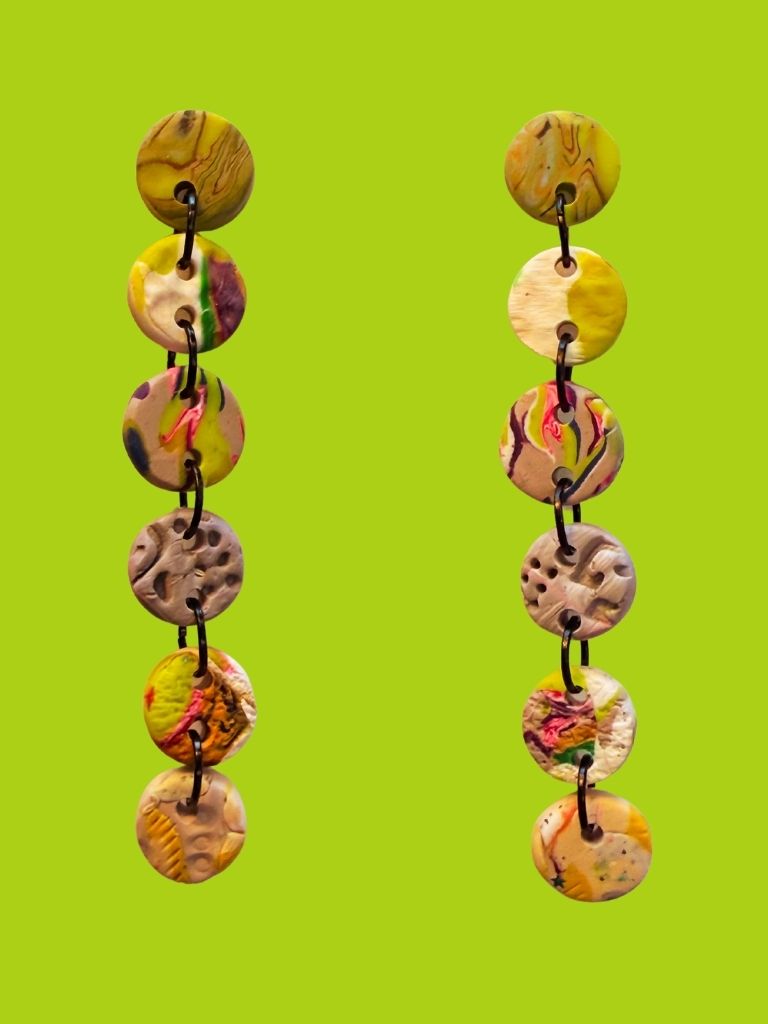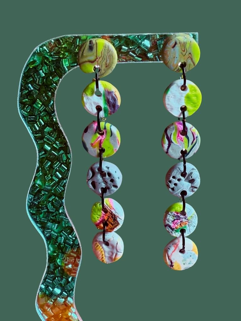From the Depth & Distortion collection, these earrings layer six small textured polymer clay rounds in gentle contrast. Shades of green, pink, white, peach, and gray create a subtle rhythm of color and form, brought to life through texture and tone. Sculptural yet soft-an understated statement that draws you in the closer you look.