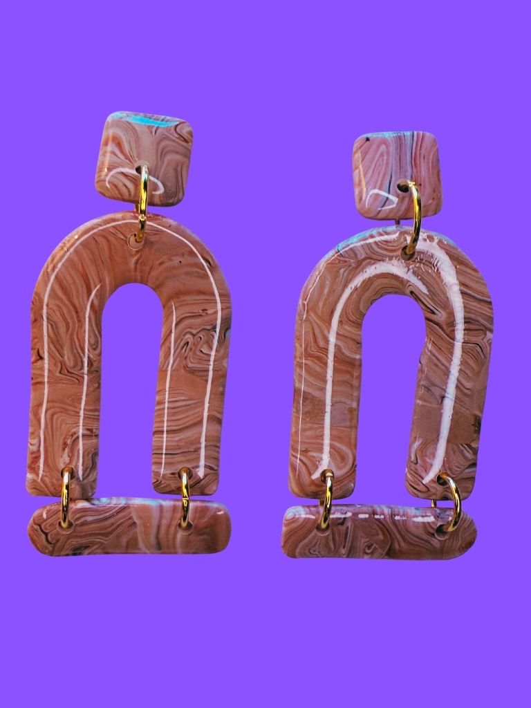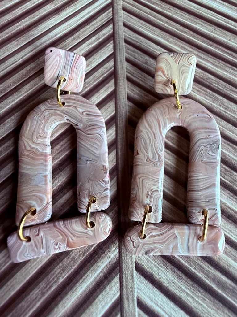 From the Terra & Forme collection, these earrings capture the artistry of earth in motion. Three polymer clay components are marbled in tones of gray, blush, white, amber, and black, creating a natural striation that feels both fluid and timeless. Textural and balanced, they reflect the calm strength of geological form - organic beauty shaped by design.