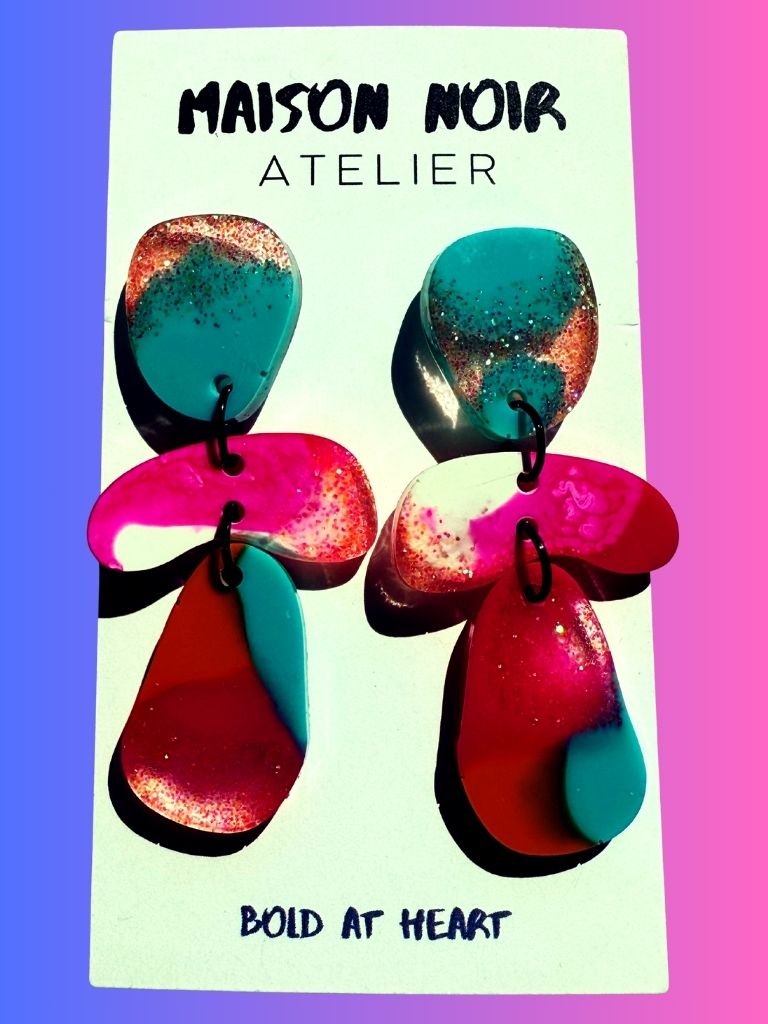 From the Vivid Voltage collection, these dangle earrings radiate color and energy. Three epoxy resin components flow together in a blend of turquoise, peach, magenta, and white, kissed with rose glitter for a soft shimmer. Fluid, vibrant, and full of motion-these earrings catch the light and never let go.